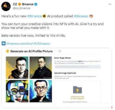 3 月1 日,币安执行长赵成鹏(CZ)在推特上宣布,币安已经推出了一款新的AI 产品,名字为Bicasso。