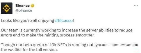 币安此次推出的AI 产品十分受到用户欢迎,在推出不久后,Bicasso Beta 的铸造名额就已经被抢光。