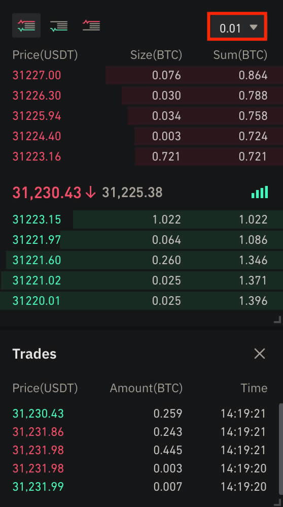 查看实时订单簿数据。在该区域右上角的下拉菜单中可以调整订单簿的精确度(默认为0.01)。在平台上实时查看之前的交易信息。
