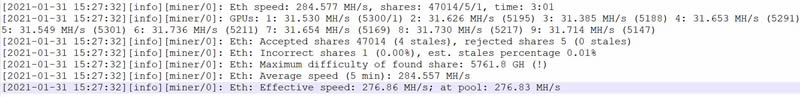 ETH挖矿软件自己报告的哈希率有多准确?我们认为这很准确。ETH挖矿软件界面窗口中显示为285 MH / s,我们的ETH矿池中计算结果为282 MH / s – 差异是由开发人员费用抽水引起的。