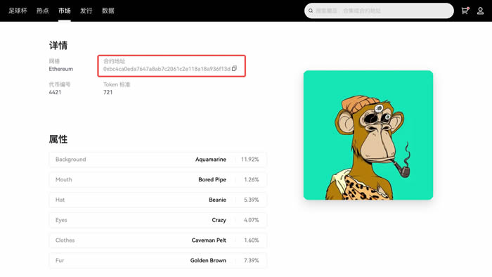 在欧易 NFT 市场,点击某一 NFT 进入详情页,下拉即可查看和复制相应的 NFT 合约地址。