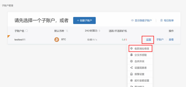 创建子账户后设置收款地址